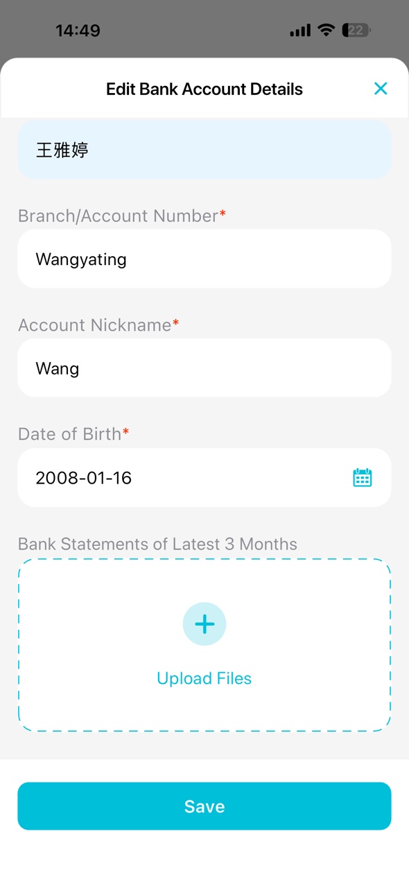 7- You could choose to upload bank statements from your device's photo album or storage, to support the account information. Press "Save" after the documents are uploaded.
